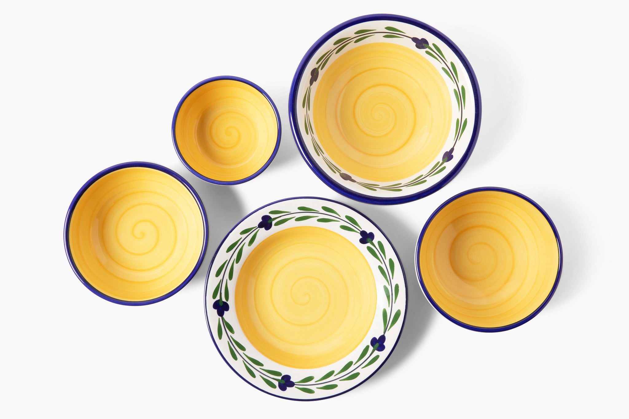 Hand painted dishes with a European flavor. Our Bella Flora pattern features an olive leaf garland with deep indigo blossoms surrounding a sunshine yellow center.
